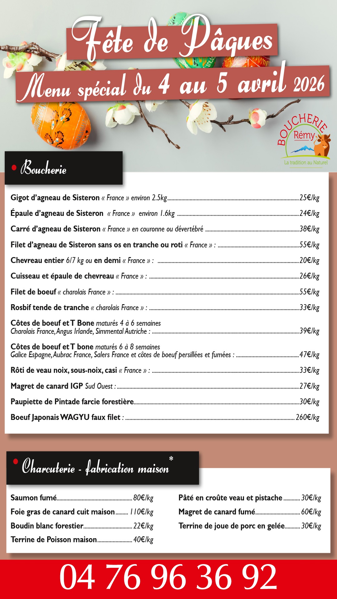 Pour commander : contact@boucherie-remy.fr ou Formulaire ou 04 76 96 36 92 Boucherie ouverte du mercredi au samedi de 7h à 13h et de 15h à 19h30 et le dimanche de 7h à 12h30.